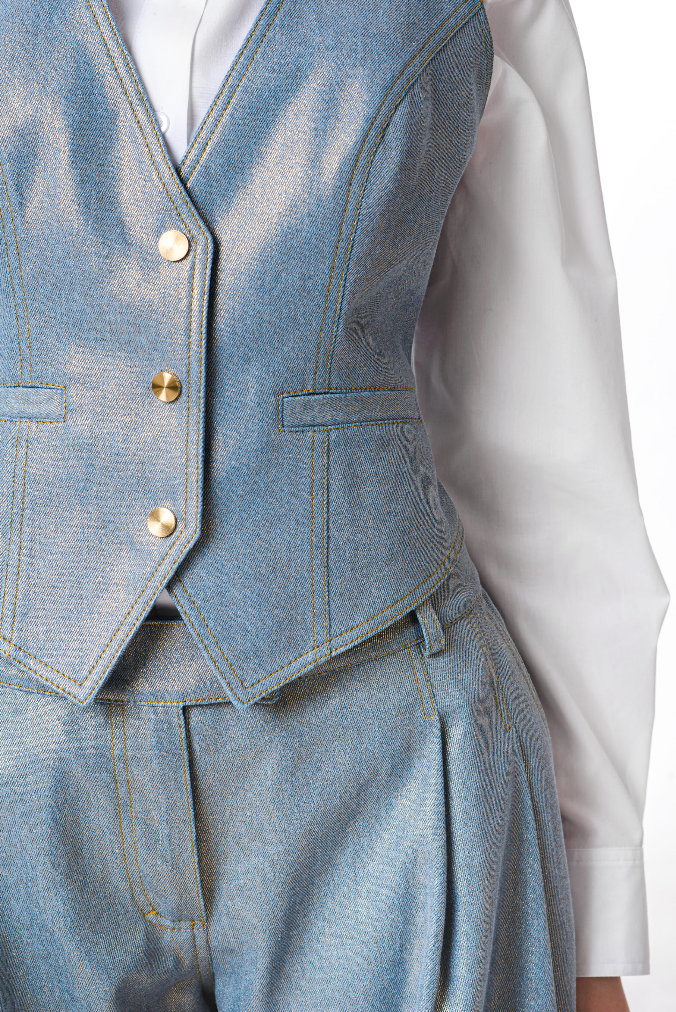 Цвет — голубой с золотым напылением. Деним плотный, мягкий. Стирка 30°, деликатная. Состав: хлопок-100%