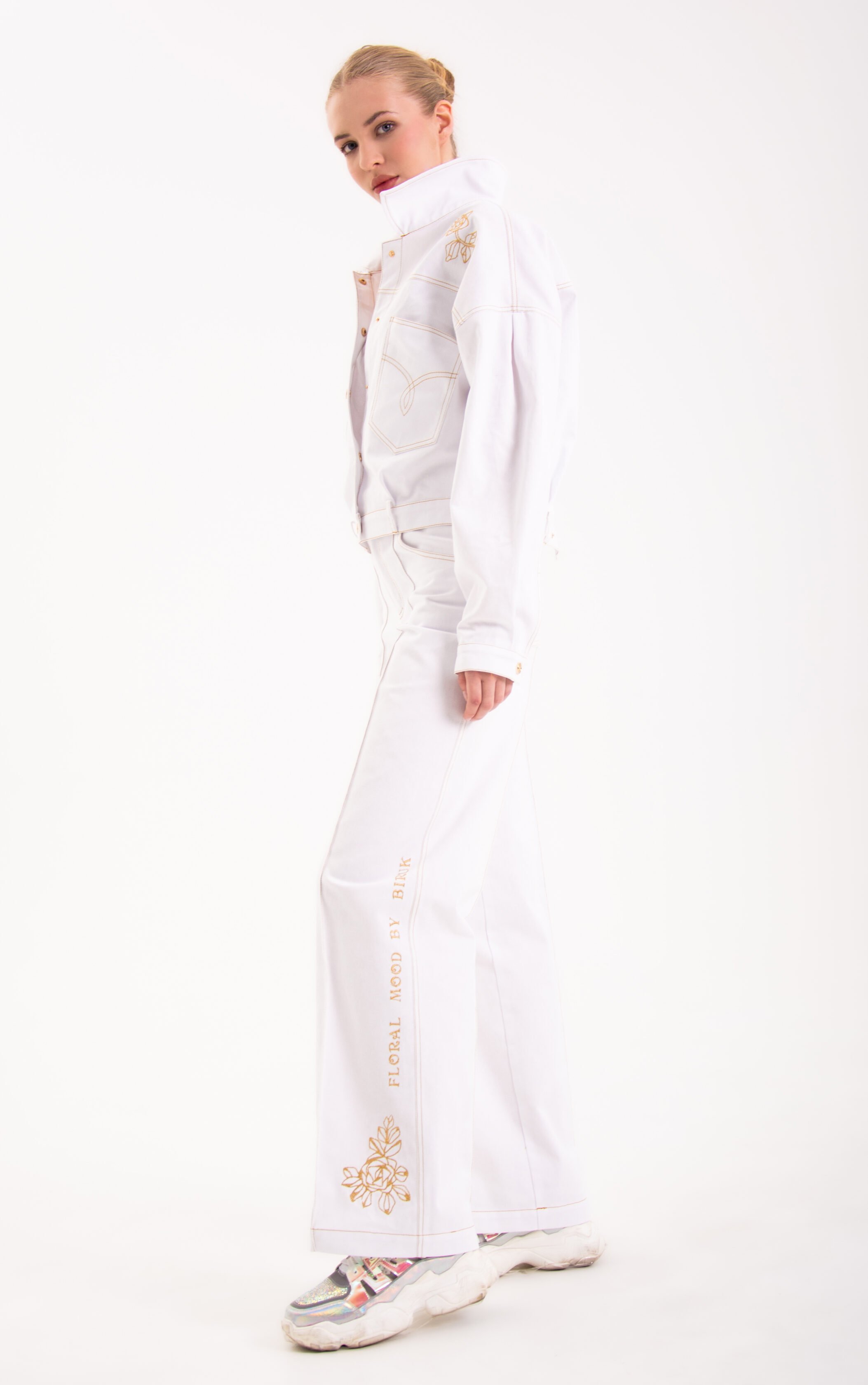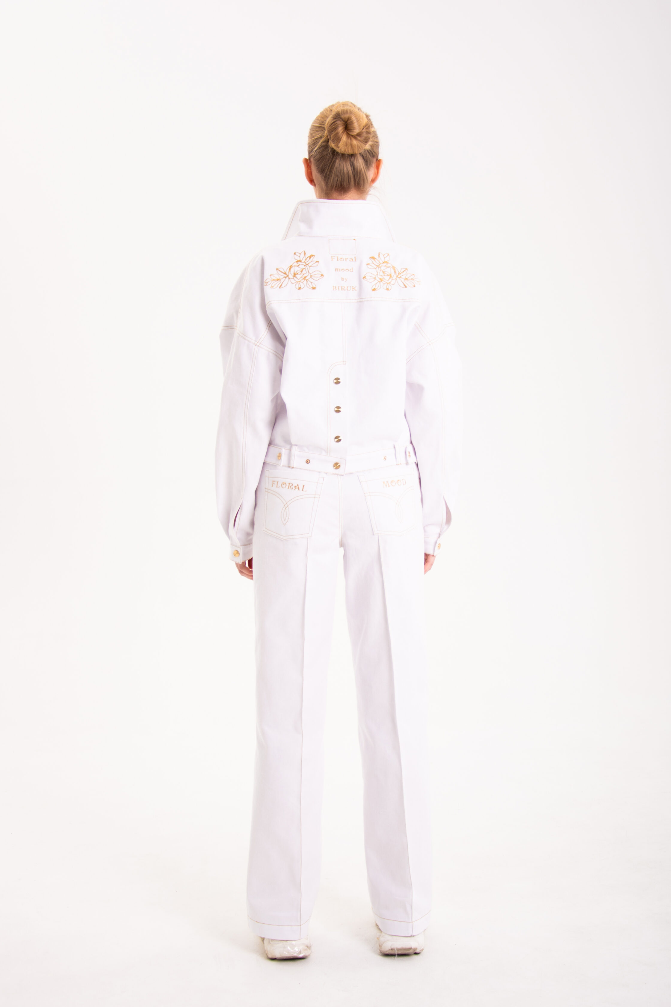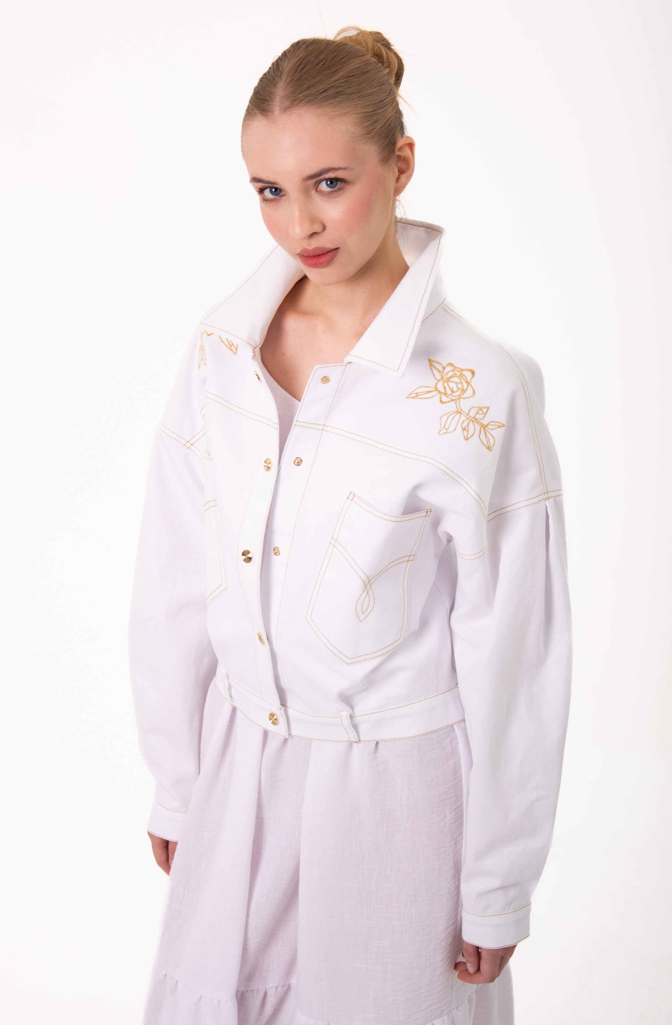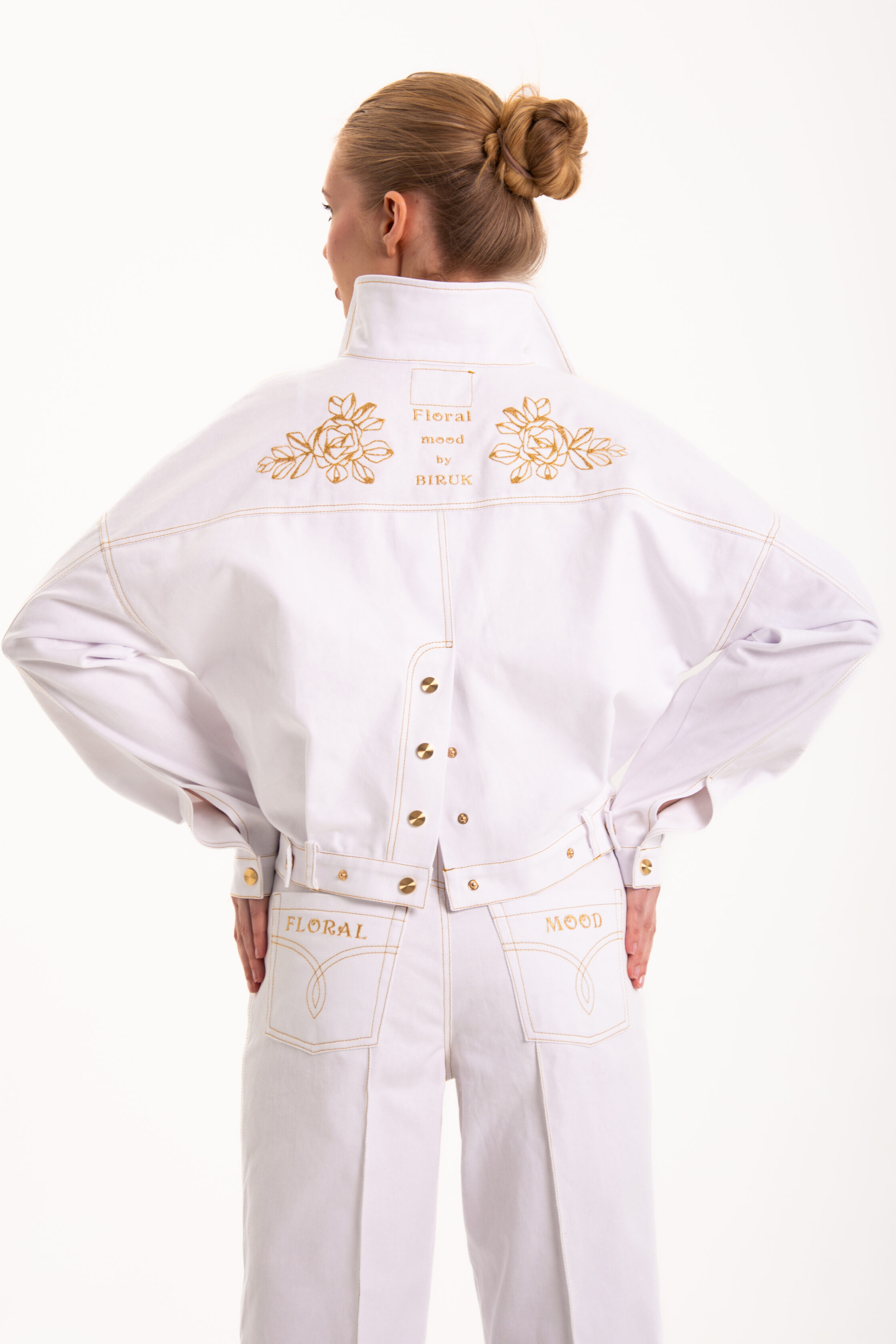 Уникальная джинсовая куртка в белом цвете, с косыми карманами по переду, золотой цветочной вышивкой по кокеткам переда и спинки, а также необычной функциональной застежкой сзади, для тех, кто любит вещи с характером.